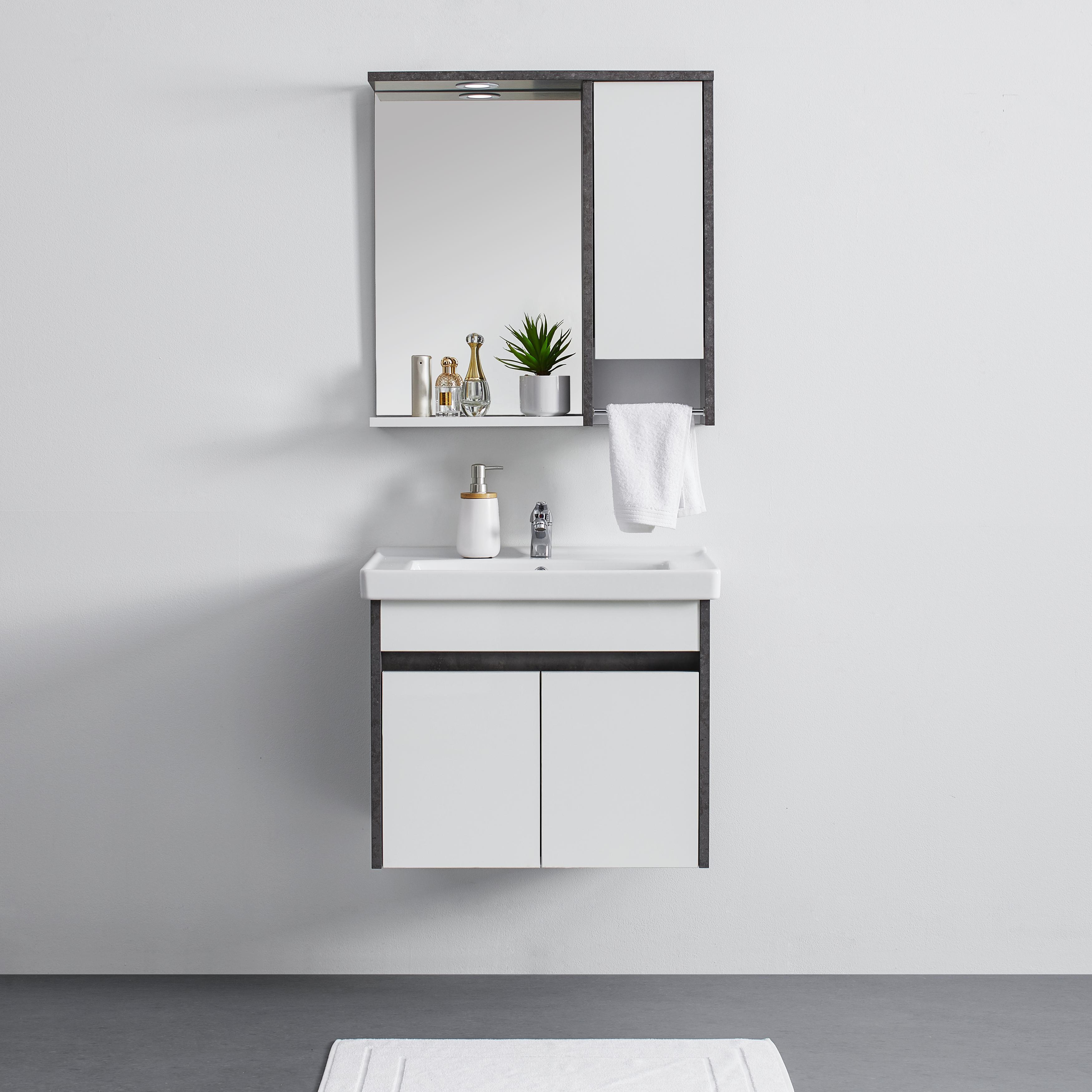 Accessoires für alle lebensbereiche modische. Mit hochschrank unterschrank hängeschrank und spiegelschrank sollte aber genug platz für alle ihre badutensilien sein. Badmöbel komplettset in weiß hochglanz anthrazit modern 5 teilig versandkostenfrei.
